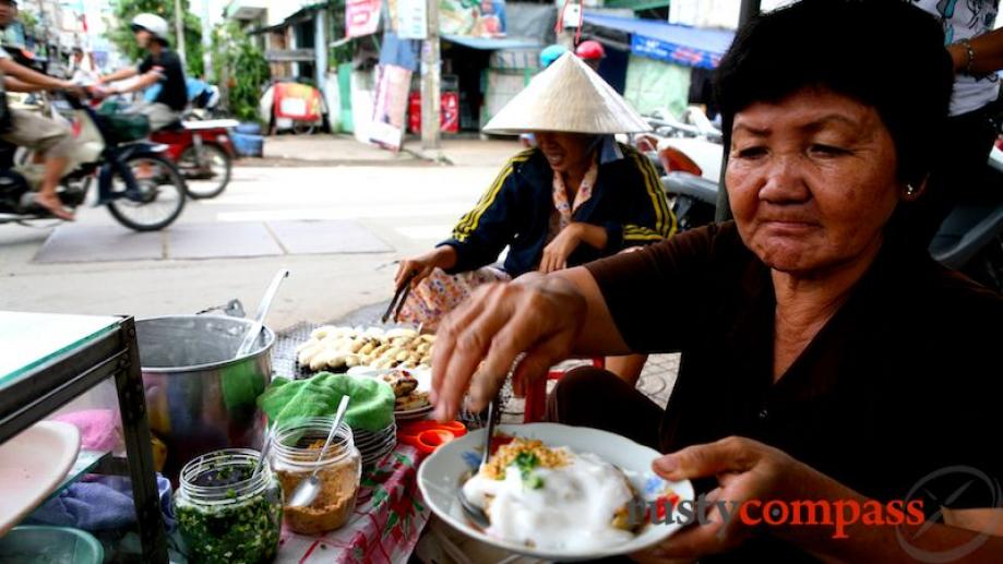 "Banh chuoi nuong" - grilled banana cake is classic southern Vietnamese street food. It's simple and delicious with sticky rice powder, coconut sauce and peanuts on top. A great way to wrap up your Cholon expedition. This stall is at the corner of Bai Say and Go Cong Streets in Cholon.