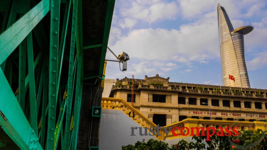 Layers of the city. The metal structure of a bridge built by Gustav Eiffel (of Eiffel Tower fame) with the heavy stone of the colonial ere Banque de l'Indochine (now the State Bank of Vietnam). In the background, Bitexco Financial Centre - Saigon's tallest building. A walk along the riverfront will bring you to Saigon's banking district.
