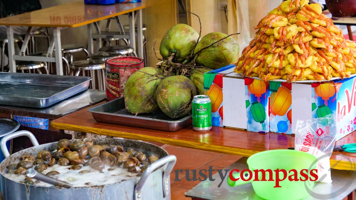 Phu Tay Ho temple is one of the most important in Hanoi so it supports a little eco-system of local restaurants serving banh tom (deep fried shrimp cake) and snails. You can usually order other local dishes at these places too.